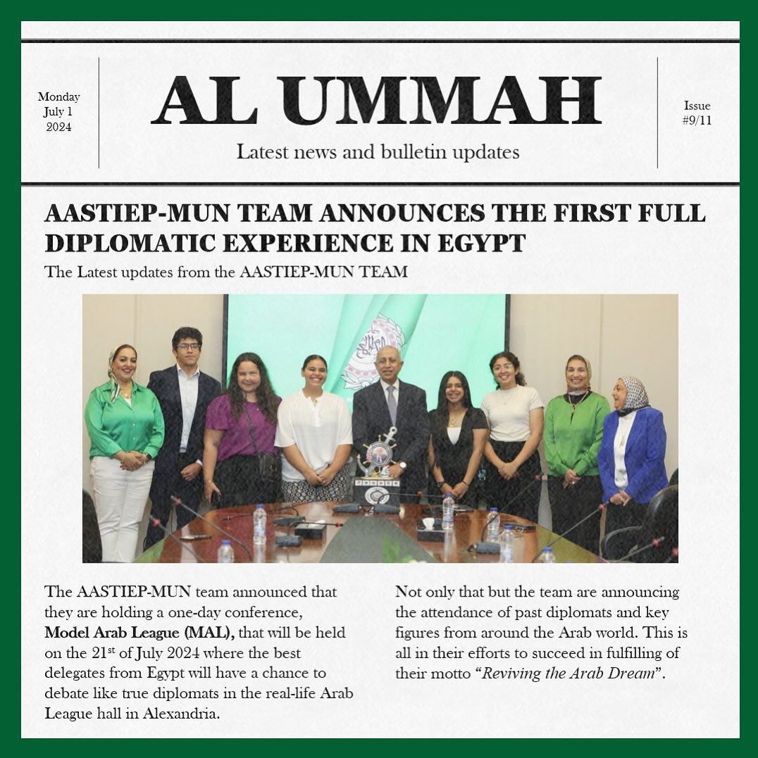I’m beyond happy to invite you to our Forth Annual AASTMT-IEP MUN Conference! As always, our conference aims to surprise you with unique vibes, giveaways, choice of topics and academic committee to make sure your whole diplomatic experience is different. This year under the theme - Diplomacy Sets Sail - we promise you an exceptional conference and we hope we exceed your expectations. Stay tuned, get ready and We can’t wait to meet everyone of yo